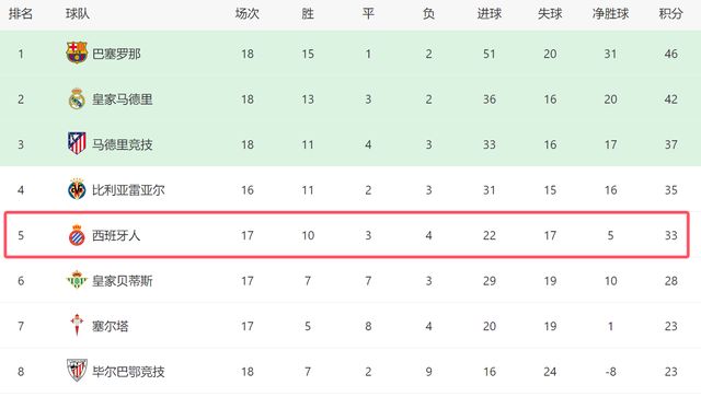 本場(chǎng)過(guò)后,西班牙人在西甲已經(jīng)迎來(lái)5連勝,他們是除了巴薩之外,西甲近期狀態(tài)最好的球隊。截至目前,西班牙人繼續排名第五,他們只落后第四的比利亞雷亞爾2分,和第三的馬競也只差4分。如果西班牙人繼續保持狀態(tài),他們甚至有希望競爭前三。